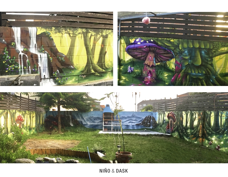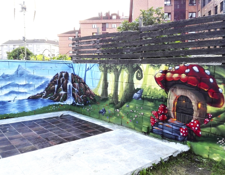 Precioso mural para el patio interior de una vivienda inspirado en un bosque de cuentos de hadas.