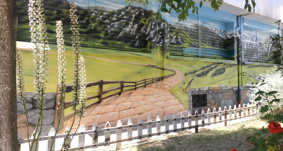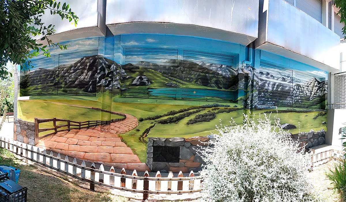 Mural de los Lagos de Covadonga en los bajos de un inmueble.