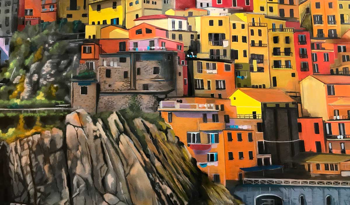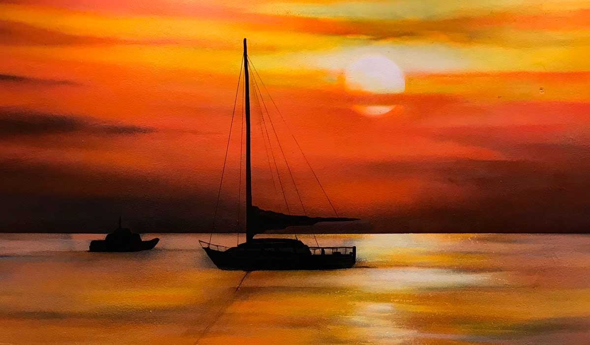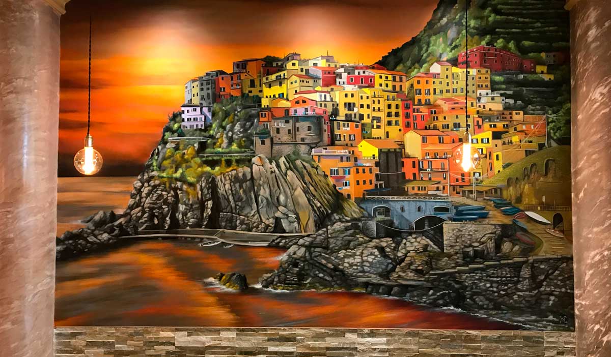 Espectacular graffiti del pueblo de una puesta de sol en el precioso pueblo pesquero para el interior de un restaurante.